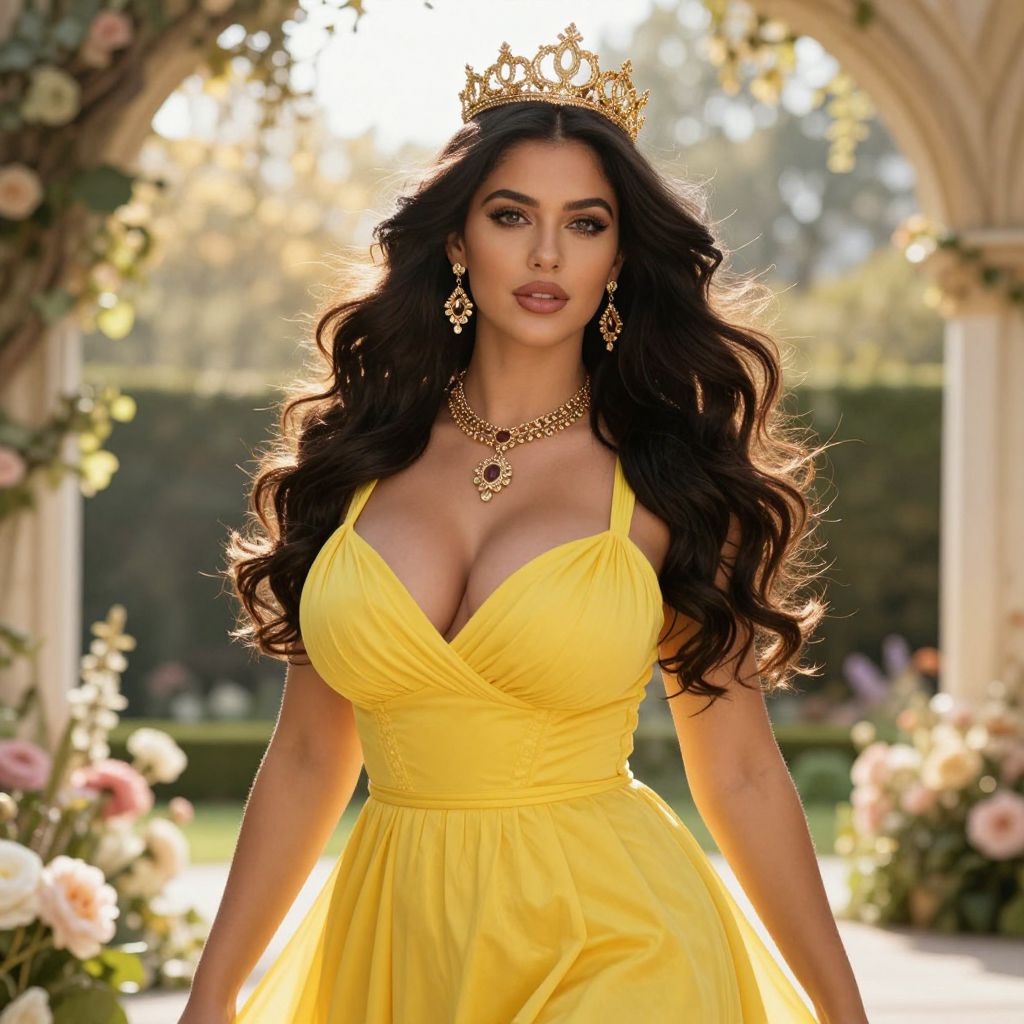 Photograph of a beautiful woman with long, wavy black hair, wearing a golden crown and a bright yellow, low-cut, V-neck dress that highlights her large breasts. She has dark, arched eyebrows, full lips, and is wearing ornate, dangling gold earrings and a matching necklace. The background features a sunlit garden with an archway adorned with flowers and greenery. The sunlight creates a halo effect around her, enhancing her regal appearance. The overall mood is elegant and royal.