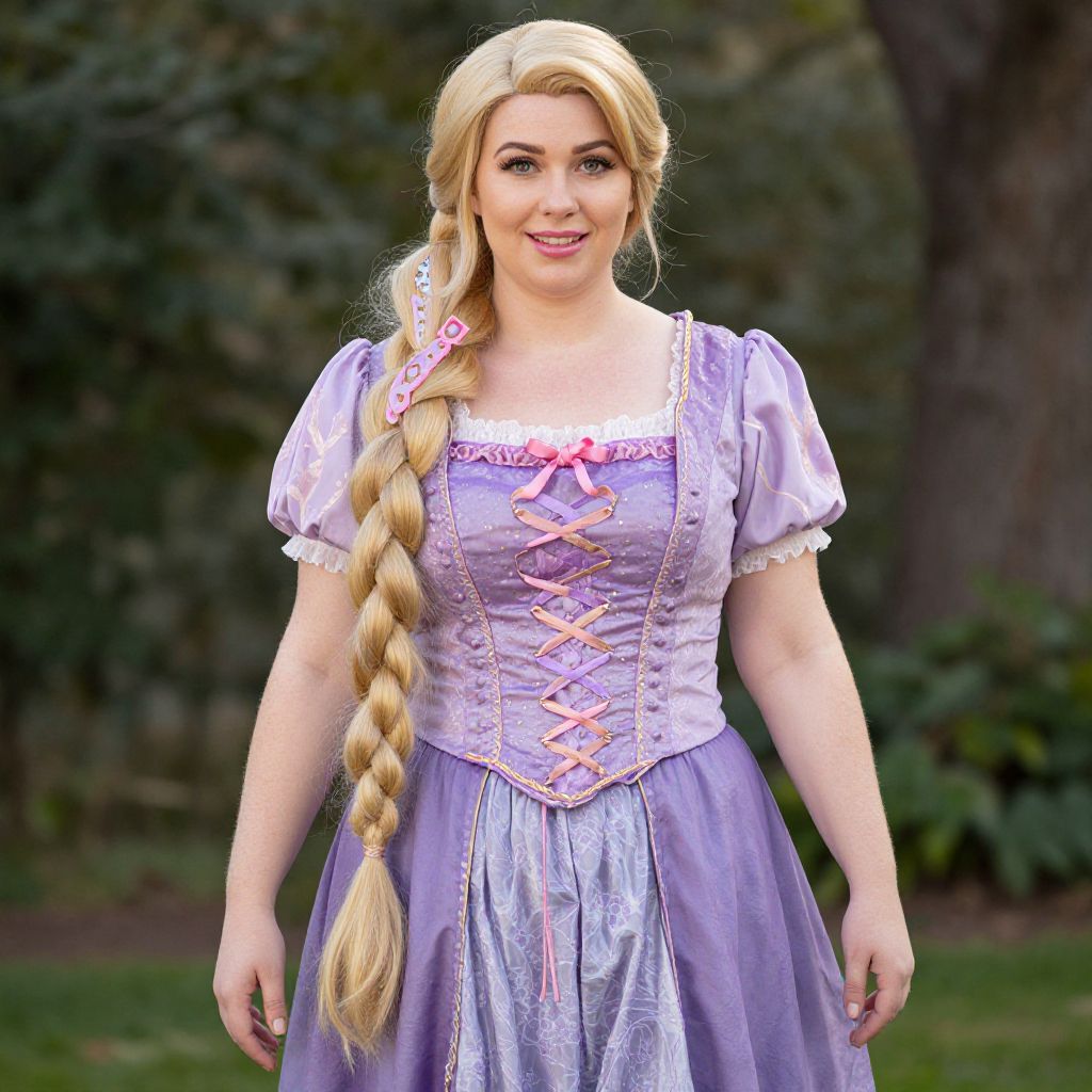 "Woman Plus Size Tangled Deluxe Rapunzel Costume, a woman in a purple dress with long blonde hair"