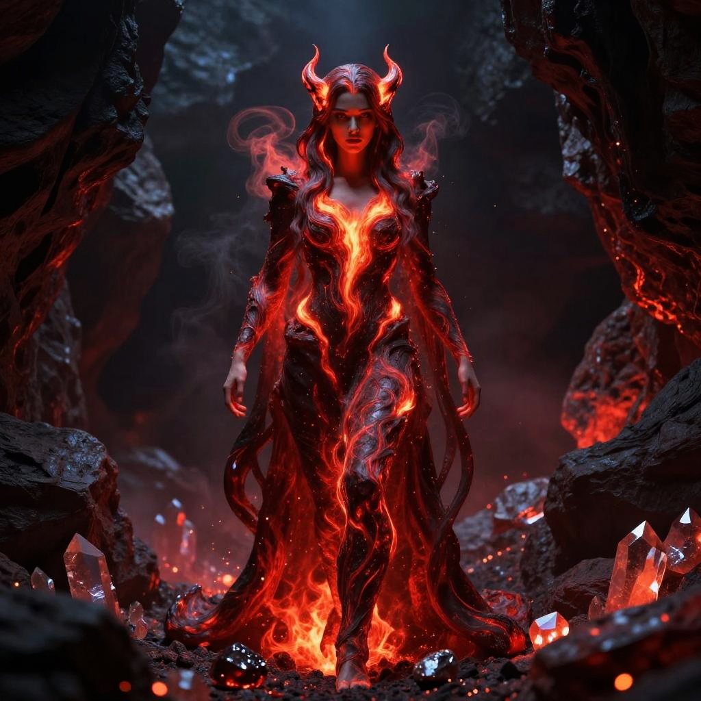 Mystical portrayal of Pele, the goddess of volcanoes and fire, depicted as a lava enchantress with glowing incandescent streaks and swirling smoke trails. She stands in a subterranean magma chamber surrounded by glowing rock crystals that emit bright red light, enhancing the dramatic volcanic atmosphere.