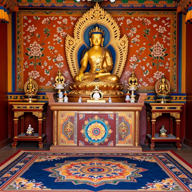 Photograph of a vibrant Buddhist altar with a golden Buddha statue, ornate red floral wallpaper, intricate wooden altar, and colorful geometric rug.