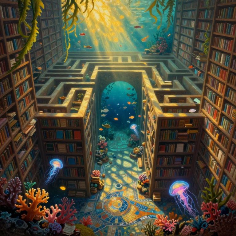 A dreamlike oil painting depicting an intricate labyrinthine library with towering bookshelves stretching into infinity, viewed from an aerial perspective above its mesmerizing mosaic floor. The scene transitions seamlessly into an enchanting underwater world where vibrant coral reefs encircle the submerged library's sunken chambers, with fish swimming among the floating books. Warm golden light filters through kelp-like vines, casting captivating shadows on the sea floor as schools of luminous jellyfish create a magical ambiance, evoking a sense of wonder and mystery in this whimsical fusion of land and sea.