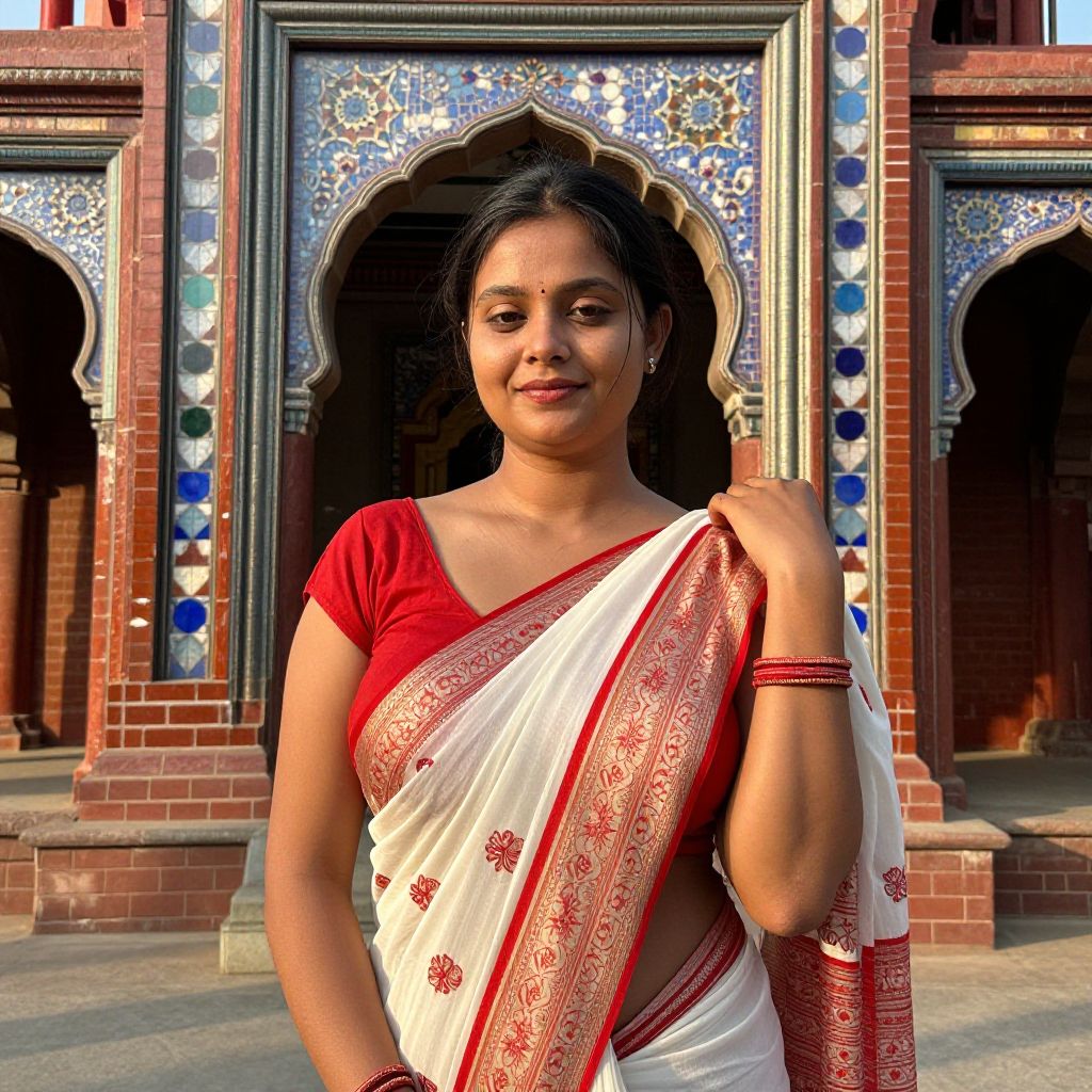 A detailed portrait of a Bangladeshi saree woman in a red and white classic saree posing in front of a traditional brick-and-tile temple in Sylhet, her face serene and slightly smiling, with gentle wrinkles around the eyes and a warm golden glow on her skin, wearing a silk dupatta with a red border, the temple’s intricate arches and colorful tiles reflecting in the sunlight. The woman has big tits and cute face