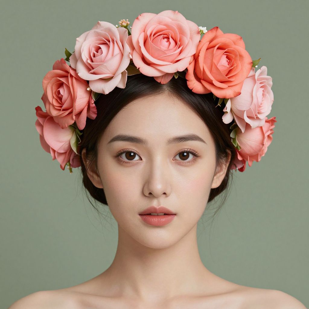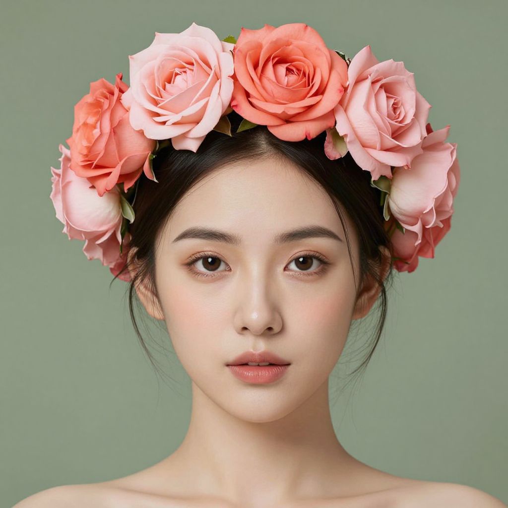 Photograph of an East Asian woman with fair skin and black hair, wearing a crown of large, pink and peach roses. She has minimal makeup, with subtle eyeliner and nude lipstick, and a neutral expression. The background is a solid, muted green. Her shoulders are bare, suggesting she might be wearing a strapless top. The roses are detailed and realistic, with soft petals and green leaves interspersed. The image is centered on her face, which is framed by the floral crown, creating a natural, ethereal look.