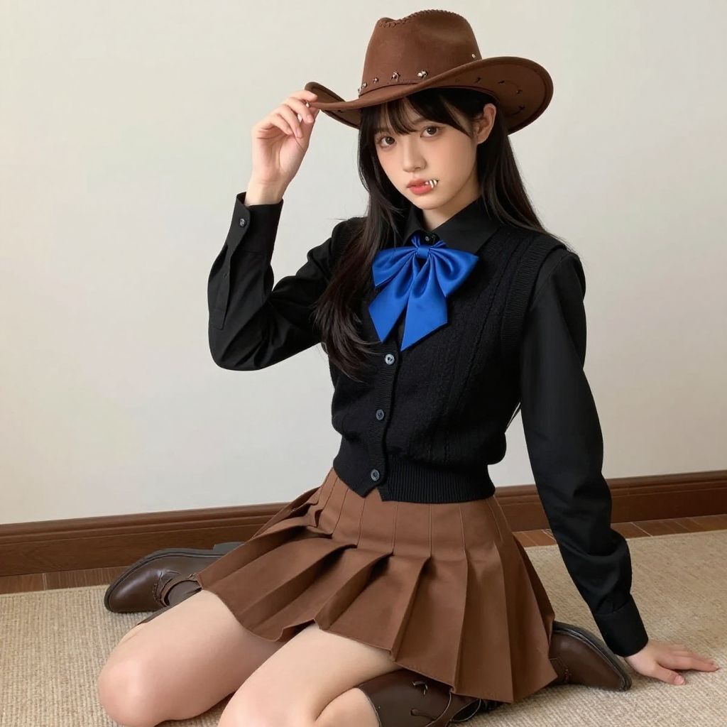 Masterpiece, high quality, highres, memcho, 1girl, solo, cowboy shot, indoors, sitting, skirt, brown skirt, black vest, sweater vest, black shirt, blue bowtie, (:3), :d, fang, tiny horns