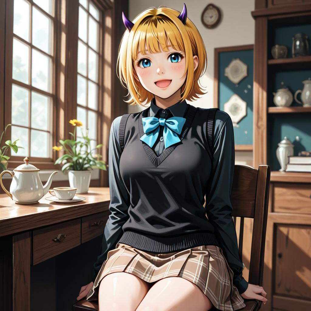 Digital anime-style drawing of a young woman with short blonde hair, blue eyes, and small purple horns. She wears a black sweater with a blue bow tie, and a plaid skirt. She sits in a sunlit, wooden-paneled room with a teapot and potted plant on a table to her left. The background includes a shelf with decorative items. She smiles warmly, exuding a cute and approachable demeanor. Light streams through the window, casting soft shadows.