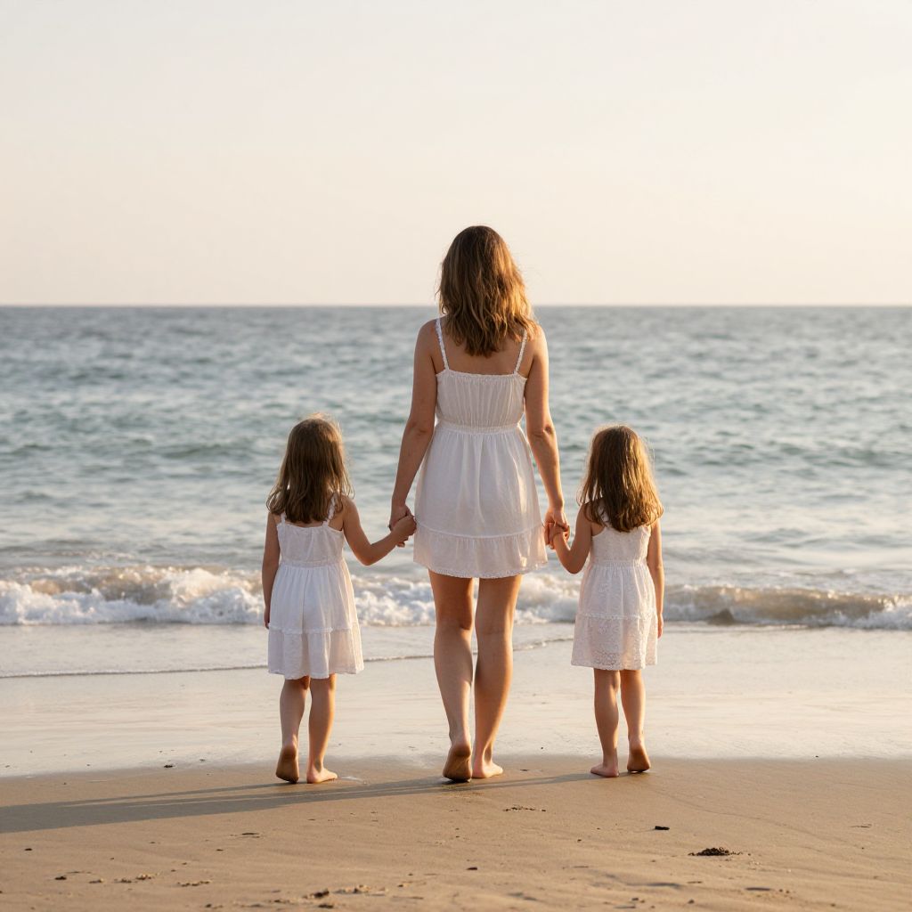 Photograph of a mother and two young daughters walking barefoot on a sandy beach at sunset. The mother, with shoulder-length brown hair, wears a white, sleeveless, knee-length dress. The two girls, both with light brown hair, wear matching white, sleeveless, knee-length dresses. They hold hands, with the older girl on the left and the youngest on the right. The ocean is in the background, with gentle waves and a bright, sunlit horizon. The sand is smooth with a few footprints. The overall scene is warm and serene, capturing a tender family moment.