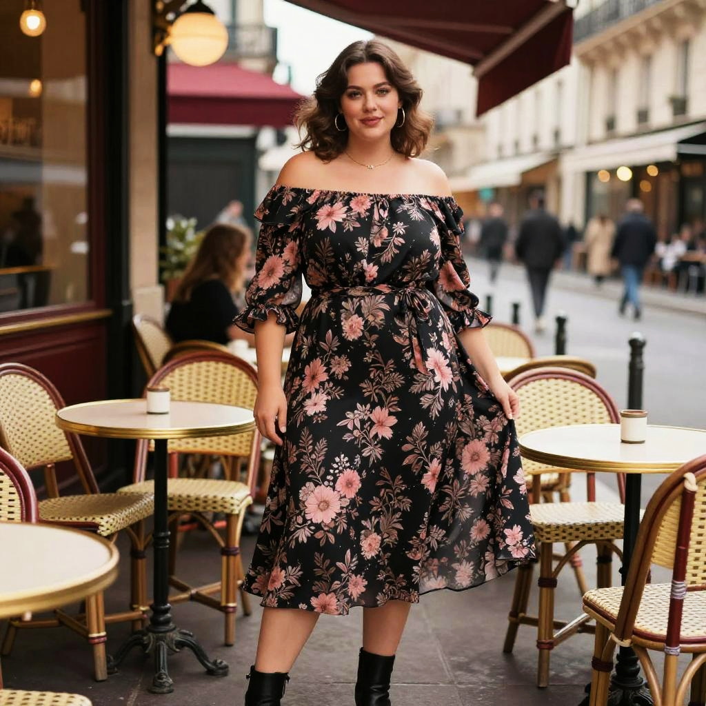 A Curvy woman, in a bohemian cold-shoulder dress with a black base and pink floral patterns, cinched waist, and black ankle boots, stands at a 1910s Parisian café terrace, surrounded by charming outdoor tables and vibrant street life, in a Yen Press visual style. Sexy. Pretty face and beutiful eyes