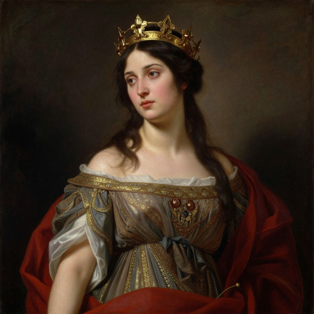 Baroque-style portrait of a fair-skinned woman with long black hair, wearing a gold crown, off-shoulder gray gown with red drap