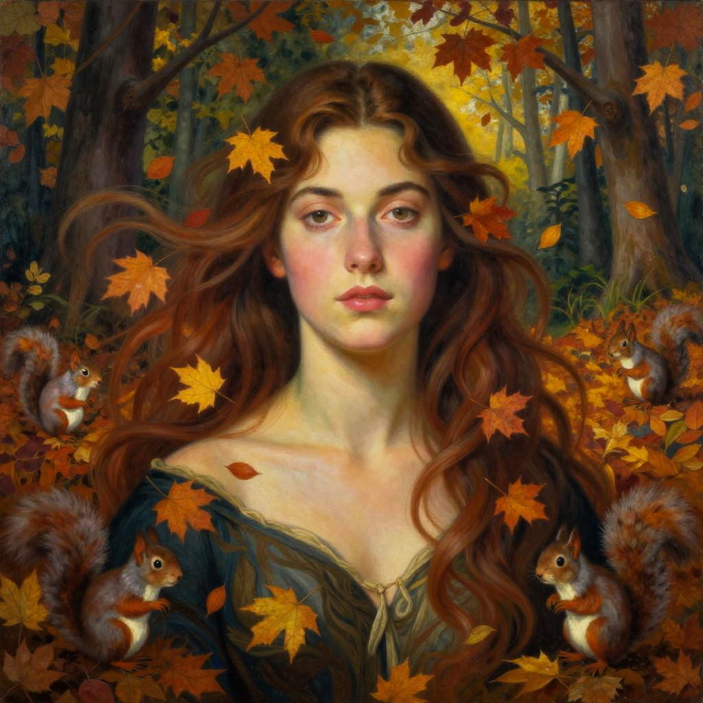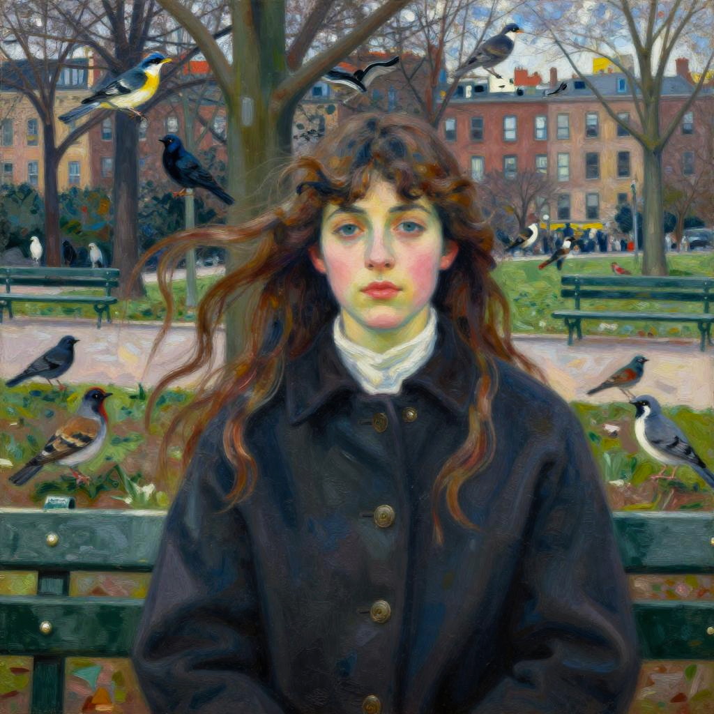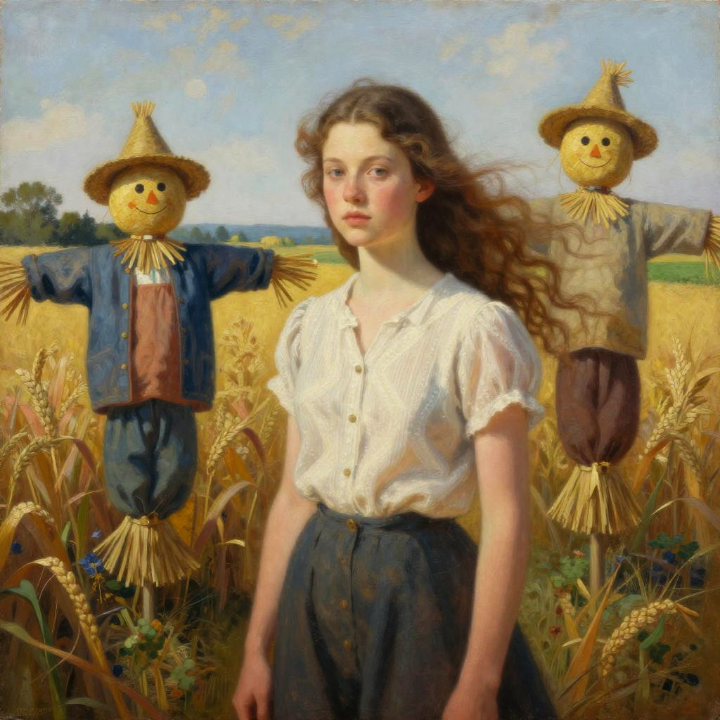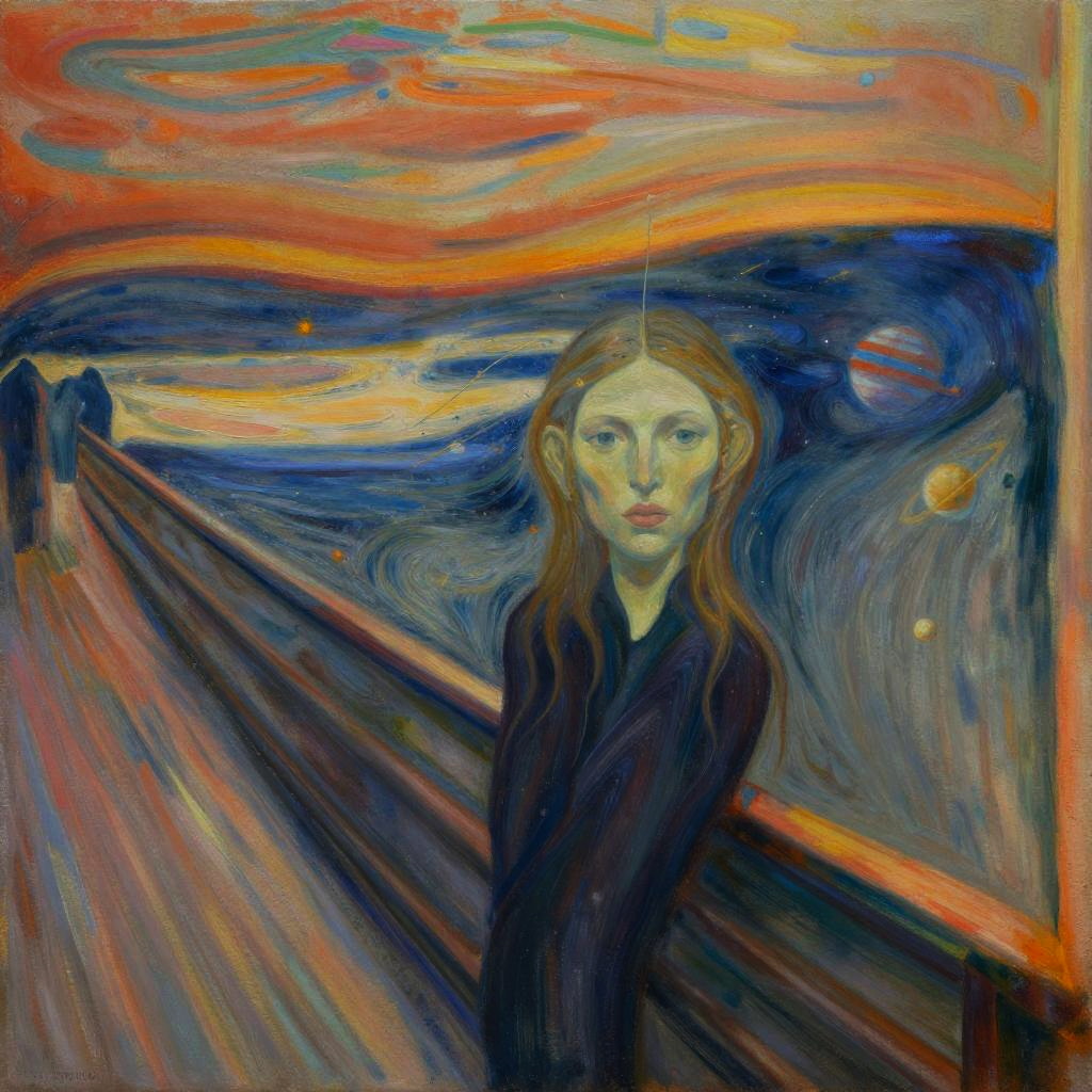 Impressionist-style painting of a young woman with long brown hair in a braid, wearing a blue dress, standing in a vibrant, colorful countryside