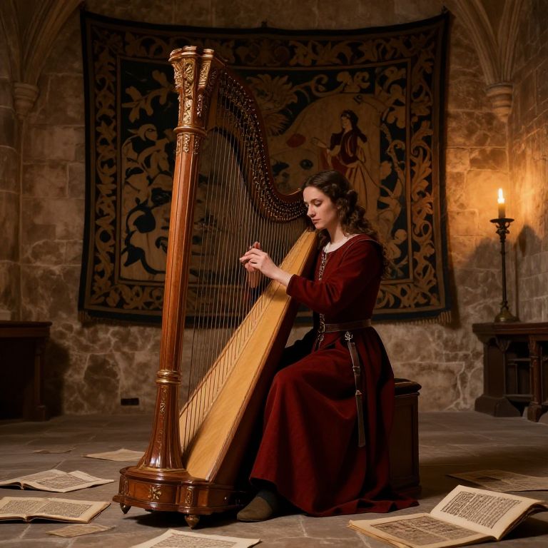 Bard medieval times playing harp inside a stone castle hall, illuminated manuscript pages scattered, rich tapestries on walls, soft candlelight casting shadows