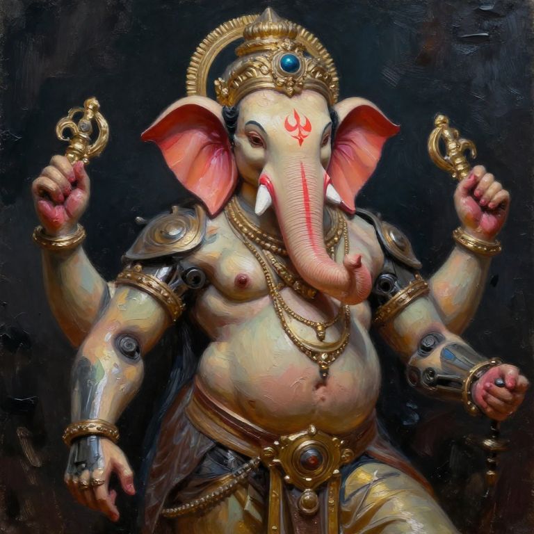 Exoskeleton Ganesha as God of Mars, ultra realistic, cinematic lighting, oil painting, thick pallet knife strokes,