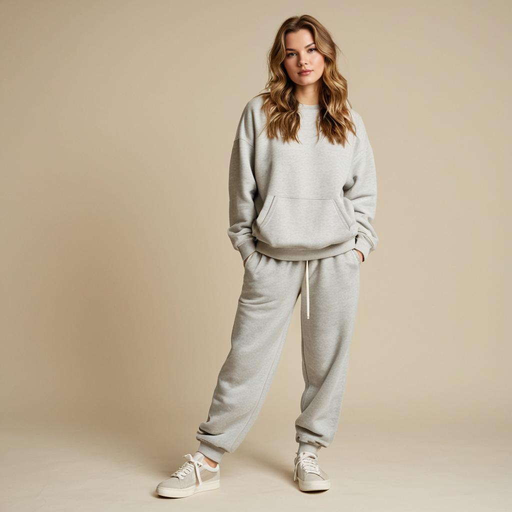Full body portrait of a young woman with light brown wavy hair standing in a relaxed pose. She wears a light gray loose sweatshirt and matching light gray drawstring sweatpants with side pockets. She completes the casual look with white sneakers. The image features a simple beige background with studio lighting, showcasing modern casual fashion with a minimalistic style.