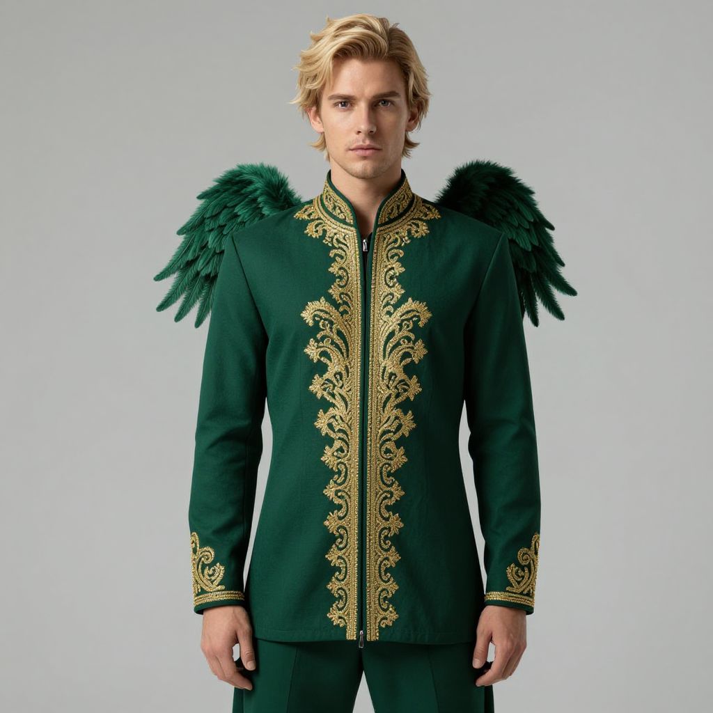 Man with blonde hair wearing a green outfit with gold embroidery on the front and wings on the back.
