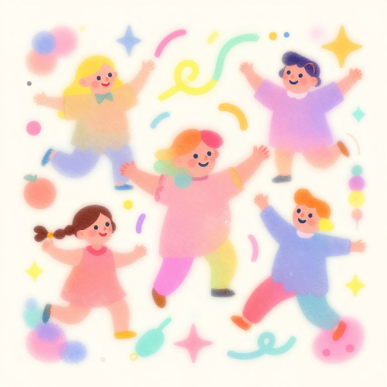 Digital illustration of five cheerful, colorful cartoon children with bright outfits and smiling faces, jumping and playing with colorful stars and swirls against a white background.