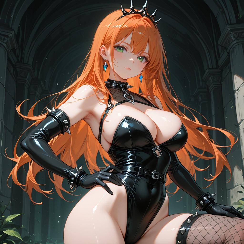 Digital illustration of an anime-style woman with long orange hair and green eyes. She is dressed in a glossy black high-leg leotard with shoulder straps, paired with long black spiked elbow gloves, fishnet thigh-high stockings, and a spike-decorated collar and wristbands. She wears a black tiara and blue crystal earrings, posed confidently in a dark, gothic arched background.