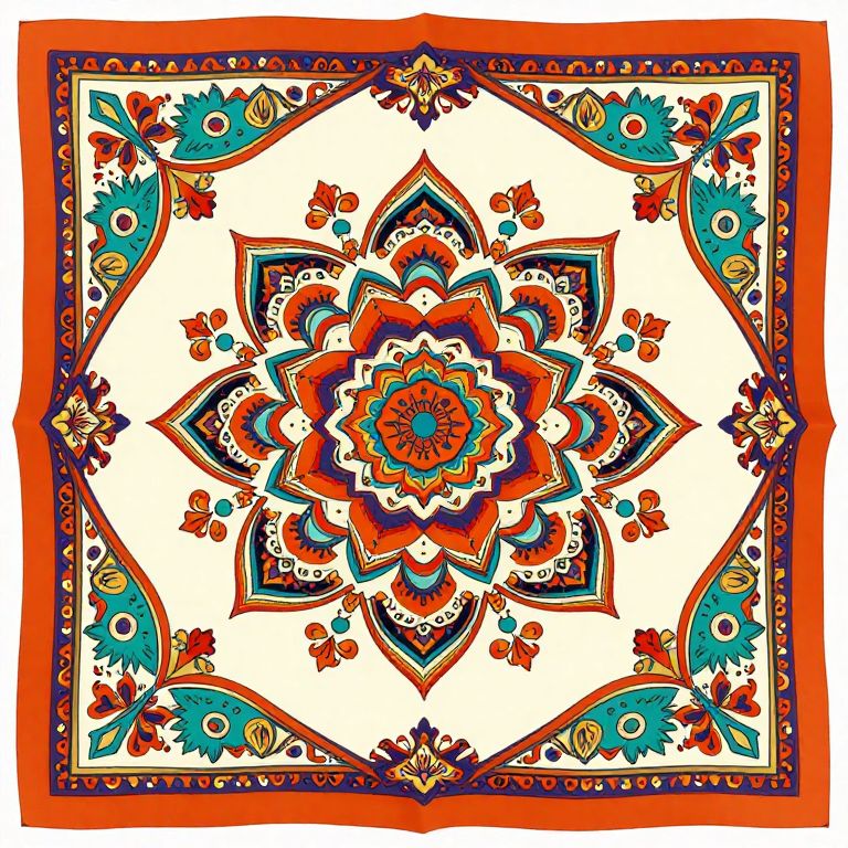 Square silk scarf with stylized mandala, patchwork ornament and paisley border in vector. Ethnic oriental motives. Summer design. In retro style vector illustration