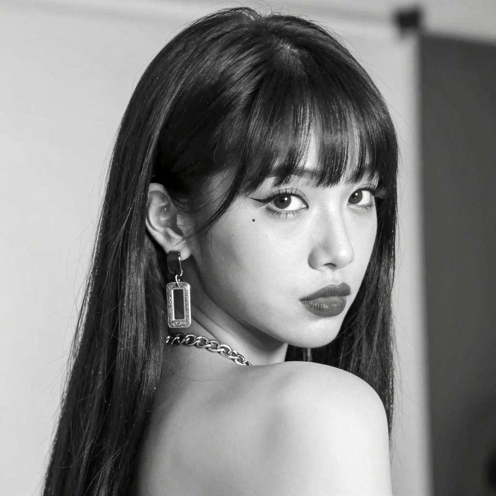 East Asian woman with black hair and blunt bangs, wearing elaborate pink and gold traditional jewelry, including a headpiece, choker, earrings, and necklace. Pink floral background. Straight forward gaze, neutral expression. Bright colors, detailed jewelry patterns. Portrait.