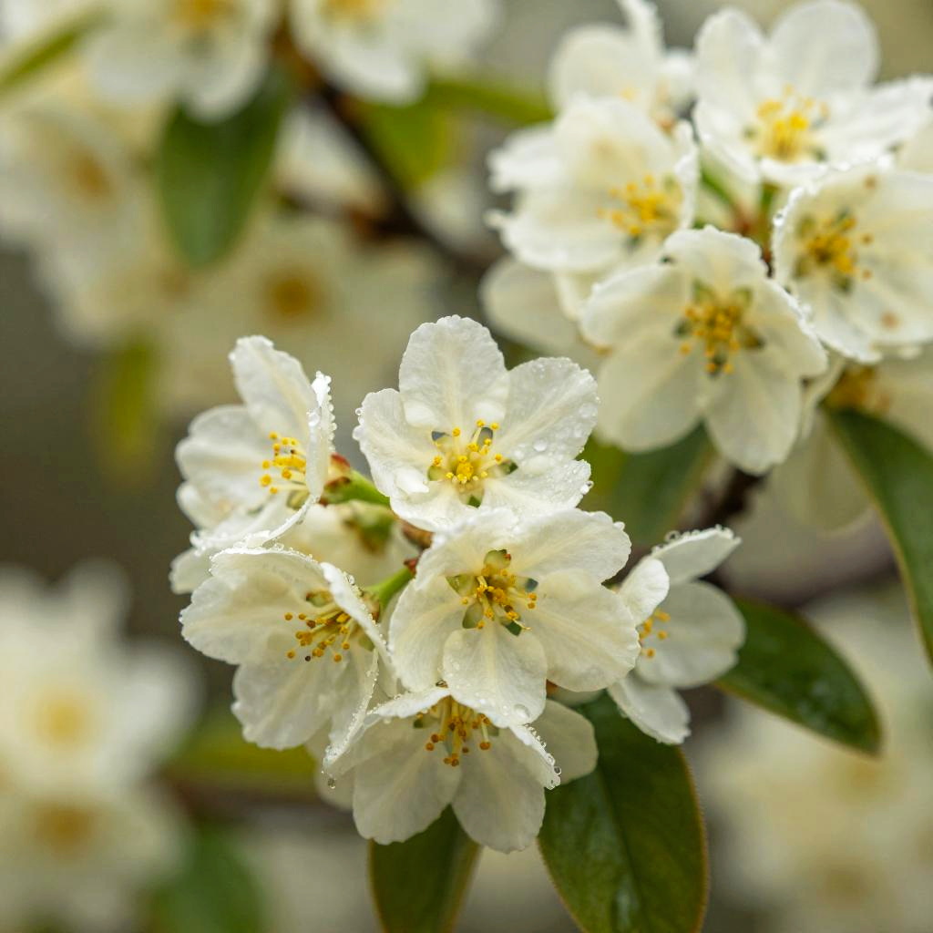 Close-up of leatherwood flowers blooming in spring, intricate clusters of creamy white blossoms with delicate green leaves, dewy morning light highlighting petal details, macro botanical art style, vibrant and natural colors