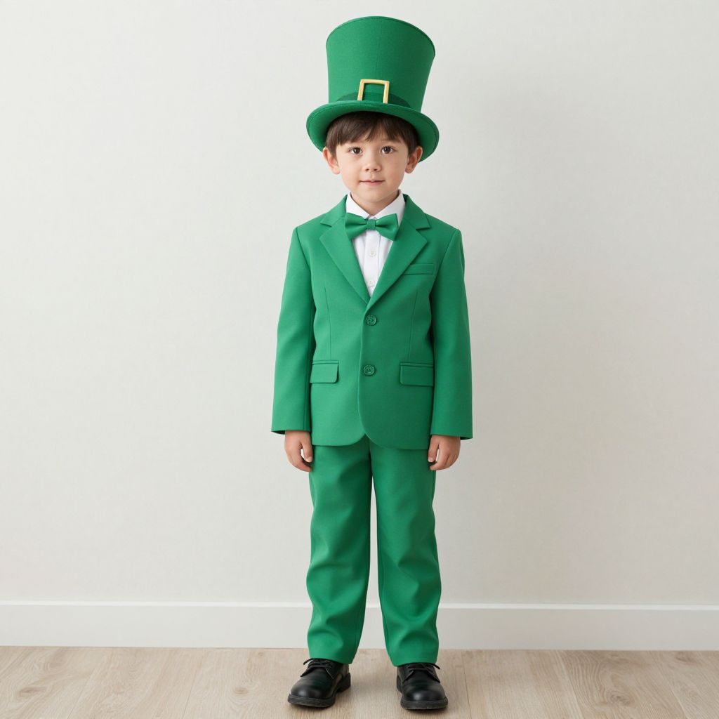 Photograph of a young boy in a green St. Patrick's Day suit, complete with top hat, bow tie, and black shoes, standing against