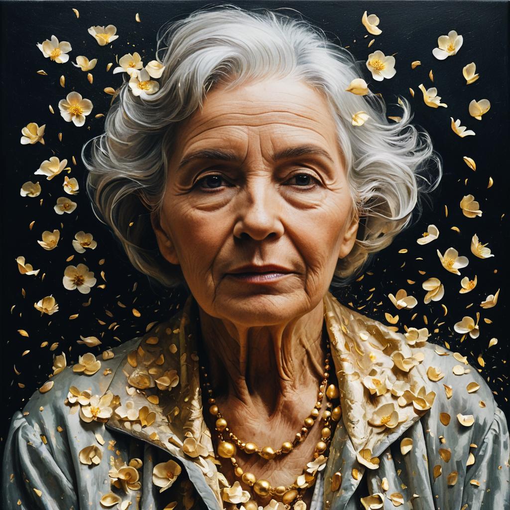 Portrait of a dancer covered in shimmering glitter, gold highlight colors, hints of pastel, misty, seductive, sensual, sultry, breathtaking, oil painting style, artistic, aesthetic modern art, hyper-realism