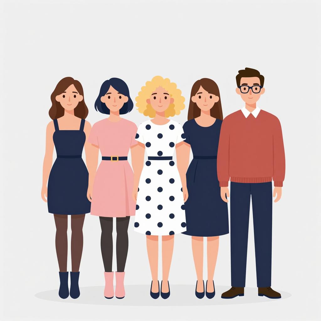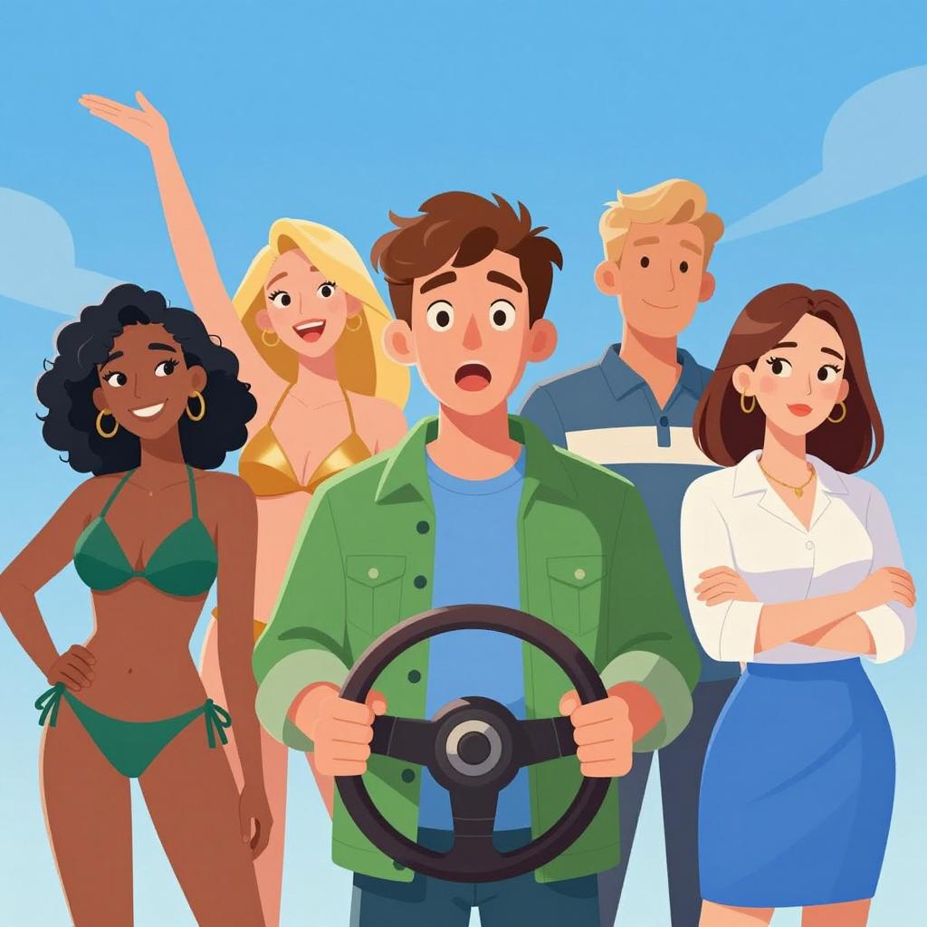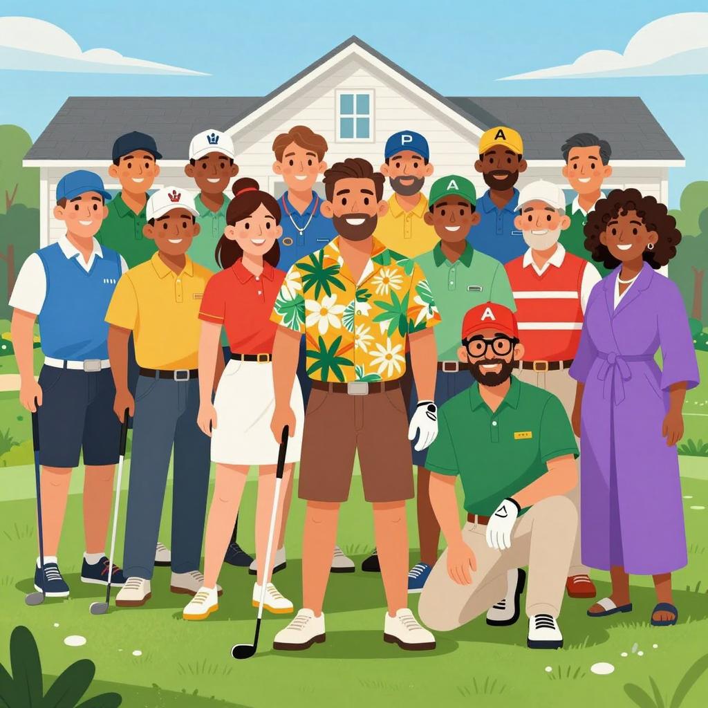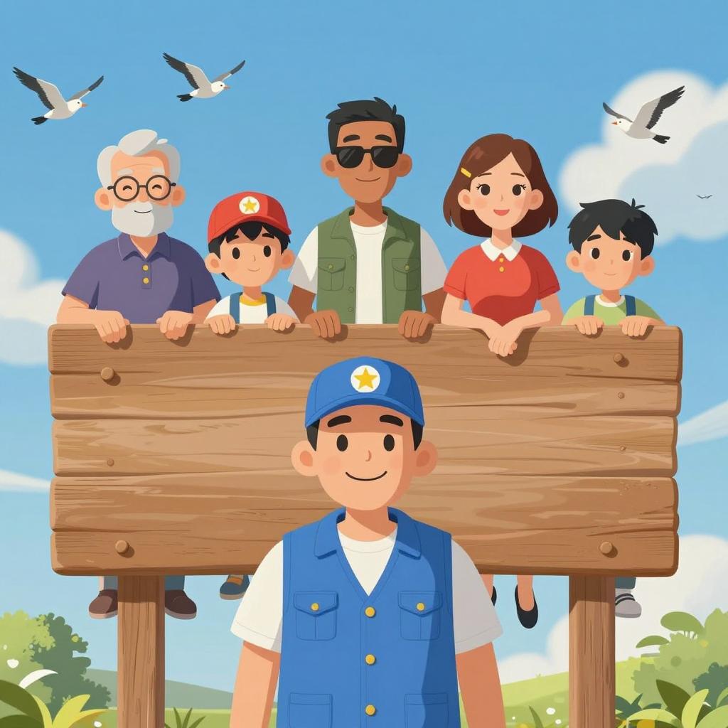 Illustration of a smiling man in a blue vest and cap standing in front of a wooden sign. Seven people climb over the sign: an older man in a purple shirt, a boy in a red cap, a man in sunglasses, a woman in a red shirt, another boy in a green shirt, and two others. Blue sky background. Birds fly around.