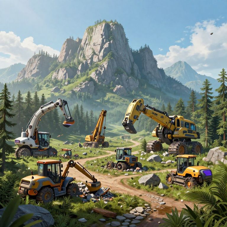 Wide Shot A lot of futuristic heavy machinery destroying forest and stone at the foot of a mountain. Fantasy fairy tale ilustration. 8k high quality.,
