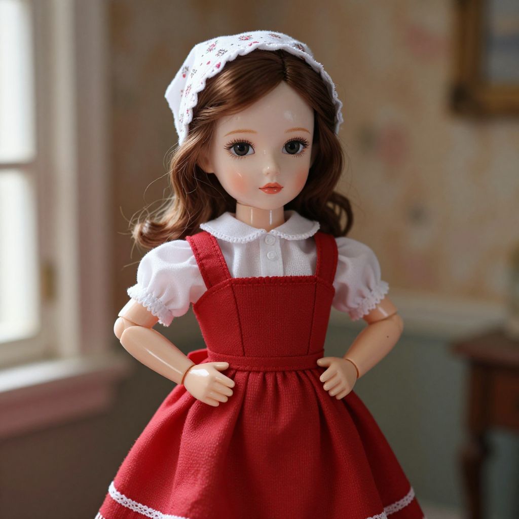 A detailed female doll with soft brown hair flowing slightly over her shoulders, wearing a classic red dress with a white blouse tucked in, and a white bonnet with a delicate floral pattern. She stands upright with her hands on her hips, facing the camera with a confident and curious expression. Her porcelain skin has a subtle sheen, and her large, expressive eyes gaze directly at the viewer, giving the image a sense of quiet charm and timeless elegance. The background is a softly lit, vintage-style interior with faded wallpaper and sunlight streaming through a window, enhancing the nostalgic, doll-like atmosphere.
