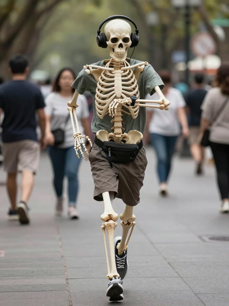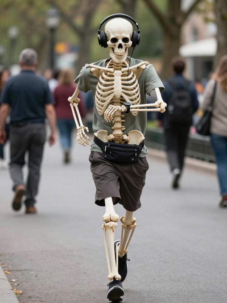 Hyper-realistic full-body photograph of a human skeleton jogging with headphones on, checking a smartwatch in a bustling urban park, wearing a casual t-shirt and shorts with a fanny pack, candid street photography style, shallow depth of field, natural motion blur, realistic lighting, high resolution, ultra-detailed, looks like a real camera photo, not an illustration or 3d render