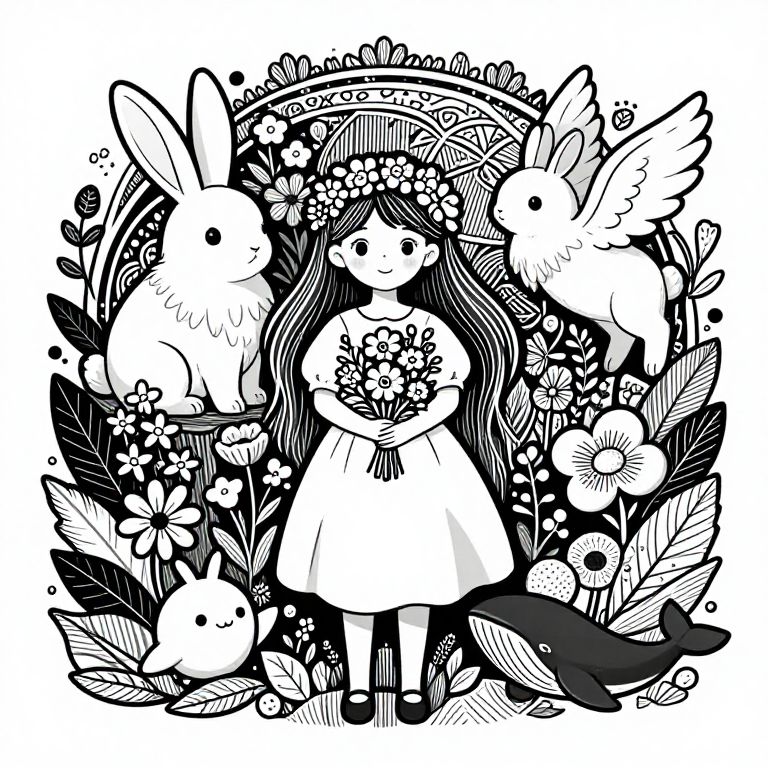 The image is a beautifully detailed vector illustration in a Studio Ghibli style, featuring bold black outlines on a white background. The central figure is a young girl with long hair adorned with a floral crown, dressed in a simple white dress with puffed sleeves. She holds a bouquet of flowers in her hands, adding a touch of nature to the scene. Surrounding her are various fantastical elements, including a large, winged rabbit with a serene expression, a small, smiling whale, and a cluster of vibrant flowers and foliage. The background is filled with intricate, layered patterns and textures, creating a sense of depth and complexity. The overall composition is balanced, with the girl positioned centrally, and the fantastical creatures and plants arranged around her in a harmonious manner, creating a sense of unity and wonder.