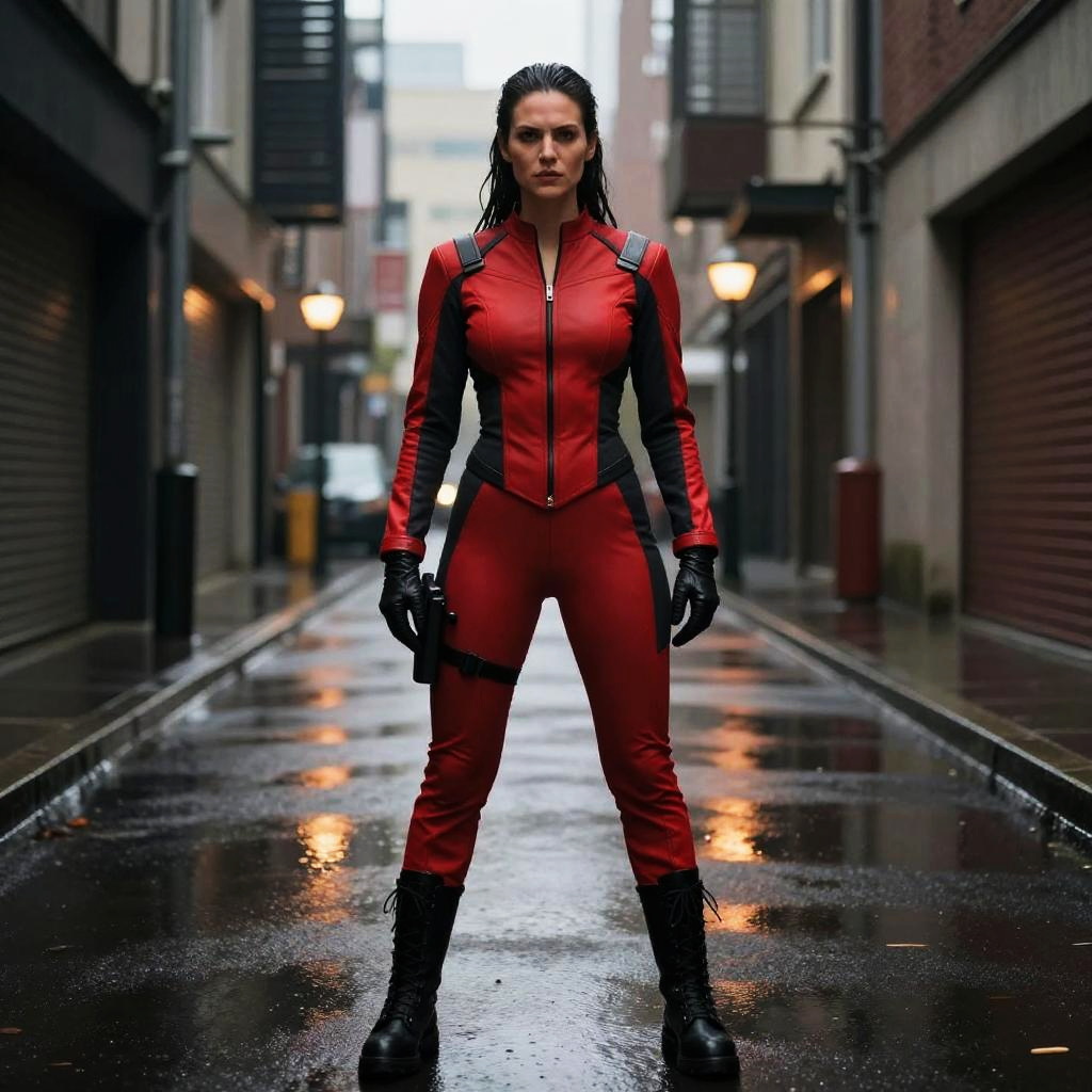 Photograph of a fierce woman standing confidently in the middle of a rainy urban alley. She's wearing a form-fitting, red and black zip-up suit with black gloves and boots. Her dark hair is slicked back, and she's looking straight ahead with a determined expression. The alley is lined with dark buildings and lit street lamps, with puddles reflecting the dim light.