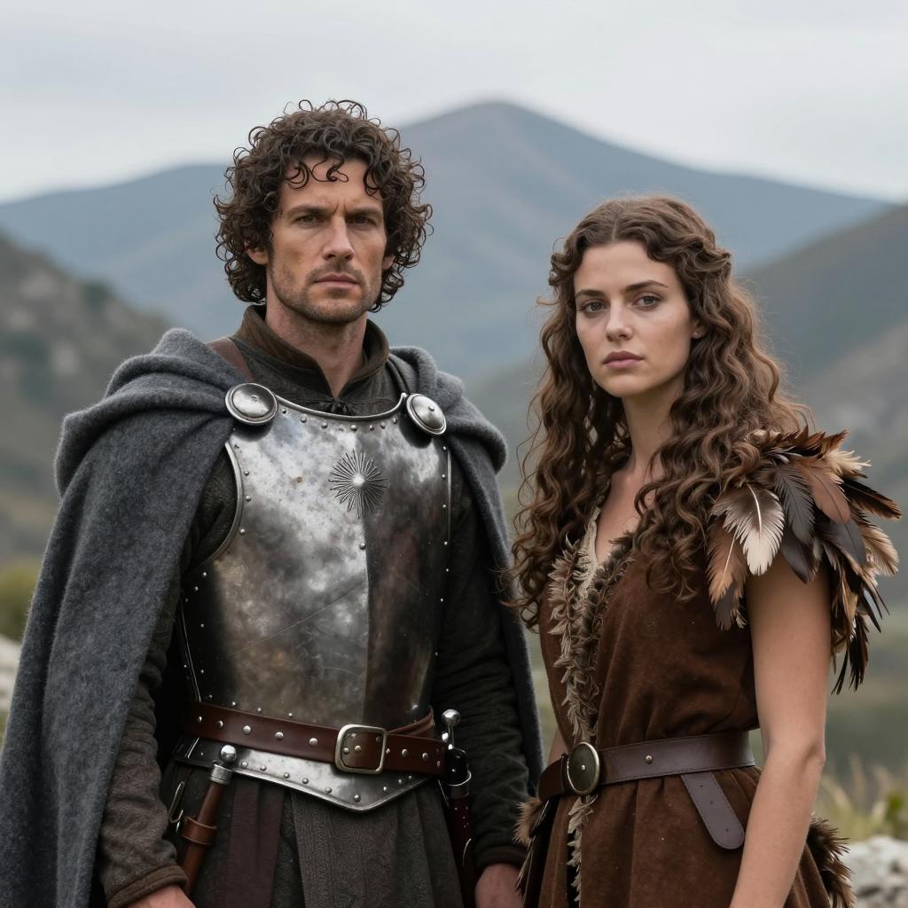 Five medieval warriors in a grassy field with green trees and mountains in the background. Leftmost woman with curly black hair, yellow cape, brown tunic, holding a red round shield. Second man with dark hair, green and gold patterned armor, pointing right. Third man in silver chainmail, helmet. Fourth man with brown hat, brown cloak, serious expression. Rightmost man with curly black hair, brown cloak, holding a sword. All stand closely together, looking towards the right.