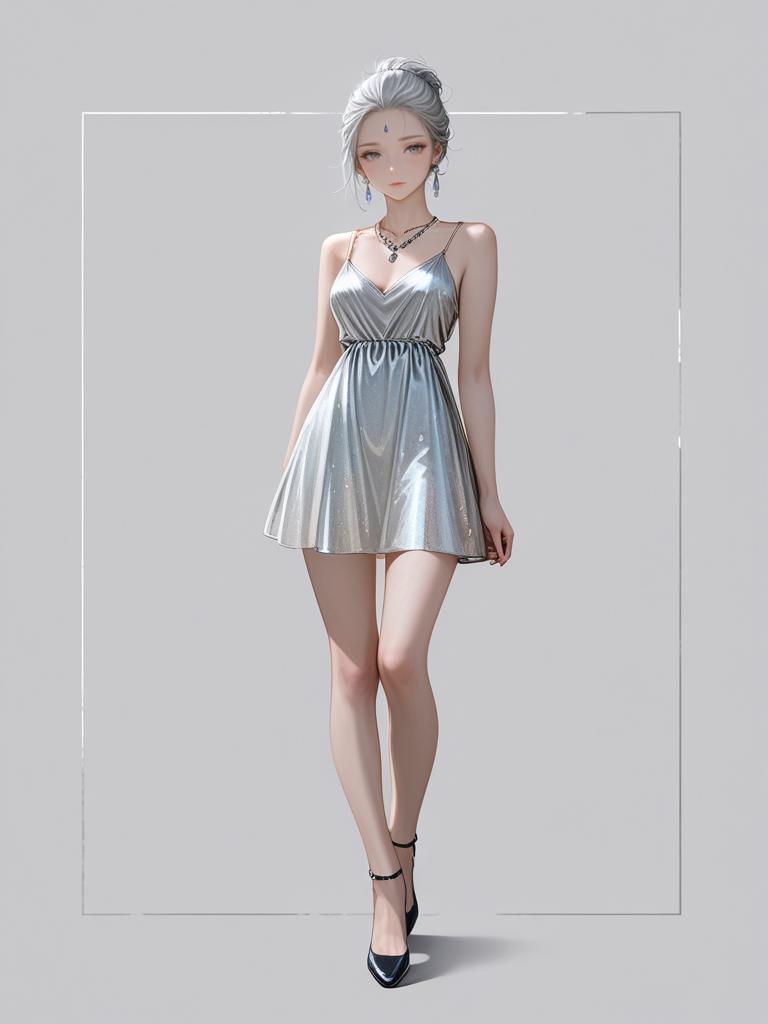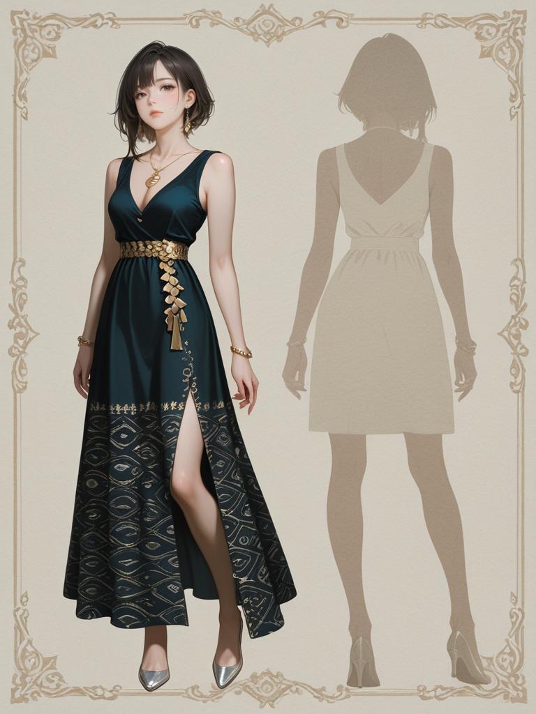 1girl, realistic face, full body shot, Woman, glam, long sleeve mini dress with gold sequin embellishments, black base color, shell-like pattern, deep V-neckline, straight hem, choker necklace.
