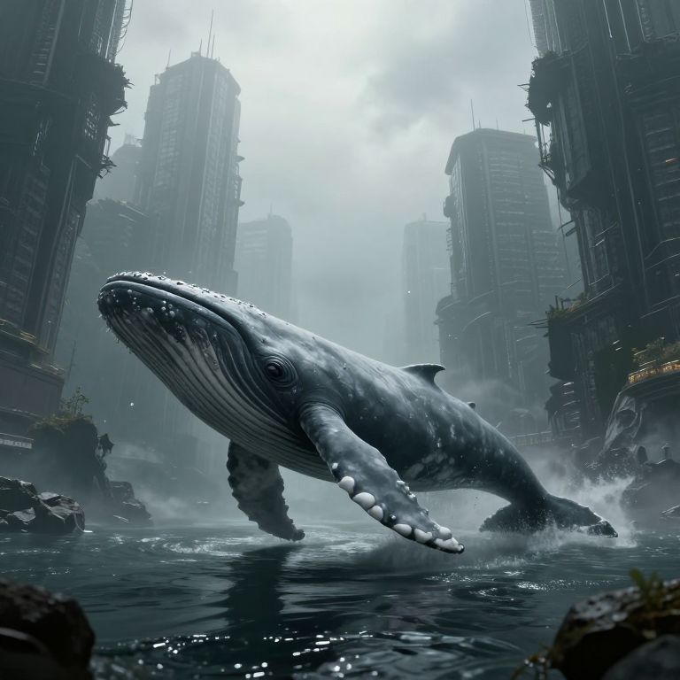 CGI image: A massive, detailed humpback whale emerges from a foggy, futuristic cityscape's flooded street, surrounded by towering, dark