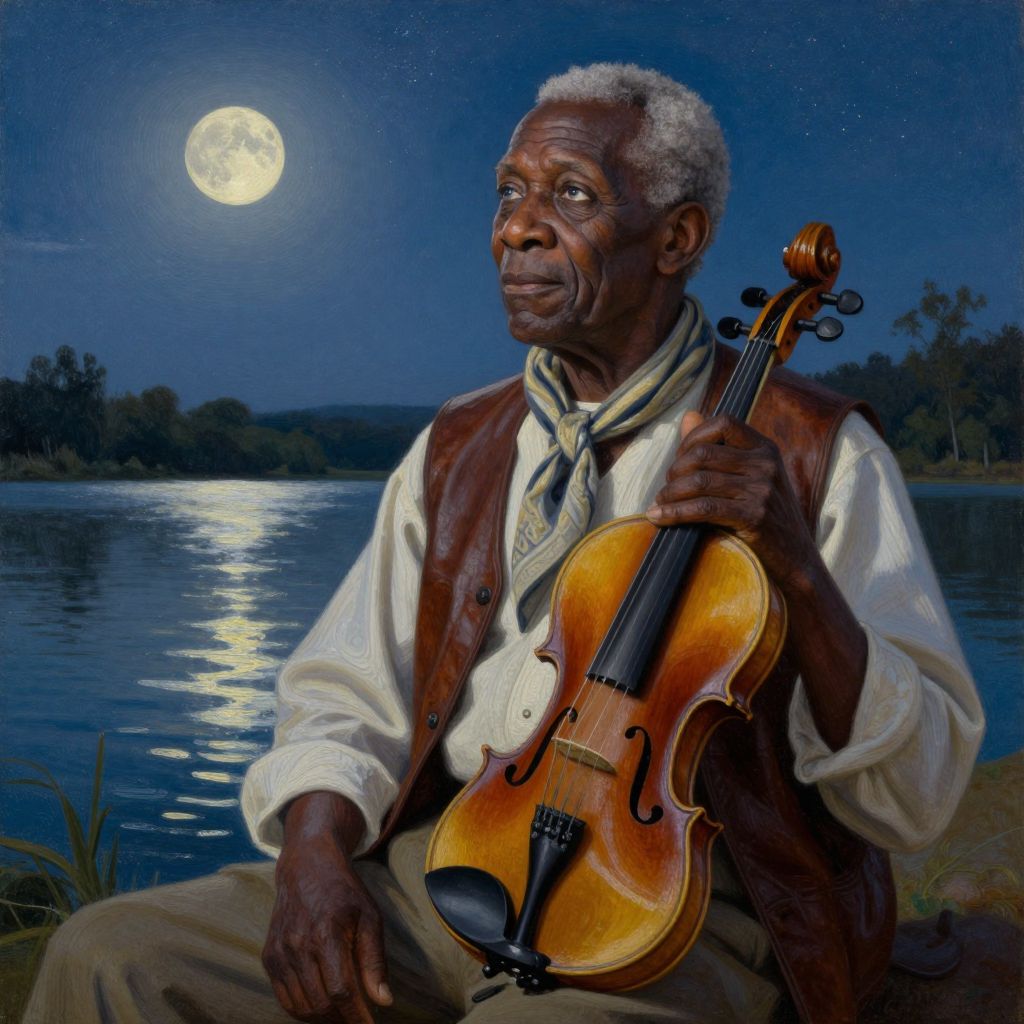 Photograph of an elderly Black man with short gray hair, sitting by a moonlit lake. He wears a white shirt, brown vest, and beige pants, with a beige scarf around his neck. He holds a wooden violin, resting it on his lap. The full moon shines brightly in a starry night sky, reflecting on the calm water. Trees are visible in the distant background. The man has a contemplative expression, gazing towards the moon. The image has a rich, vibrant color palette with deep blues and warm wood tones.