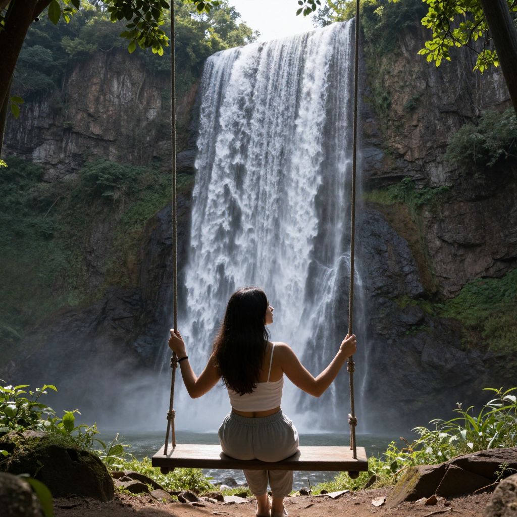 Woman sitting on a wooden swing, suspended by ropes, gazes serenely at a majestic waterfall cascading down a rocky cliff, framed by lush green foliage and bathed in soft sunlight.