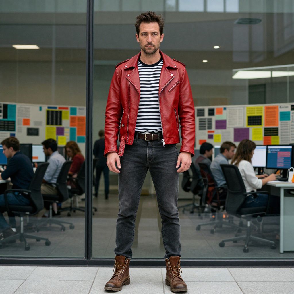 A man, red faux leather biker jacket, black and white striped tee, dark grey skinny jeans, rugged brown lace-up boots, modern glass façade, bustling newsroom, vibrant editorial boards, 3M ferrania analog film stock, confident expression, bold contrast. Man has masculine face and piercing eyes