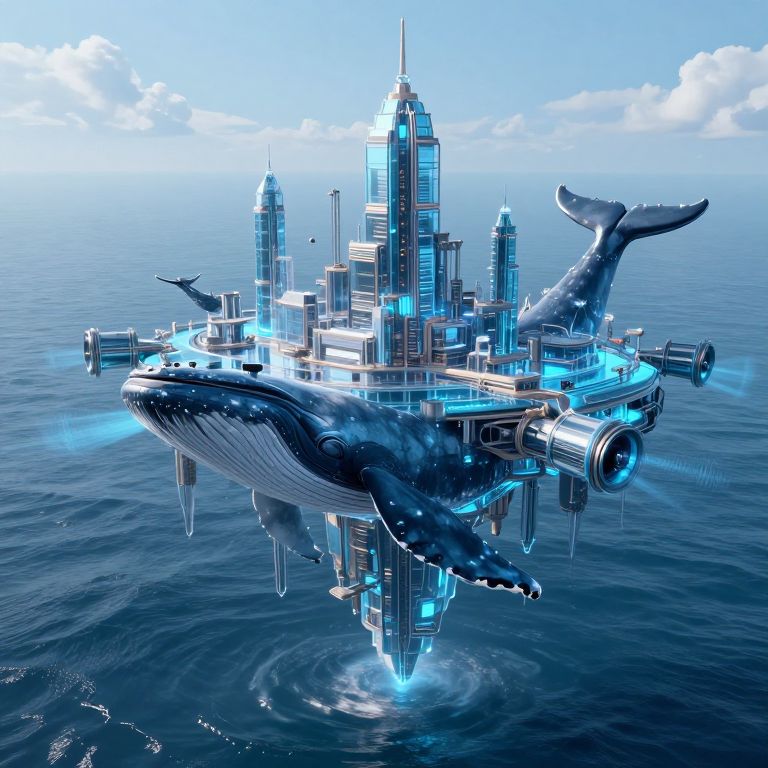 A futuristic, cyberpunk-inspired 3D render depicts a colossal, glass-encased floating city suspended above the ocean, supported by sleek pillars and illuminated by the synchronized humming of whale-song engines, creating a mesmerizing blend of technology and nature.