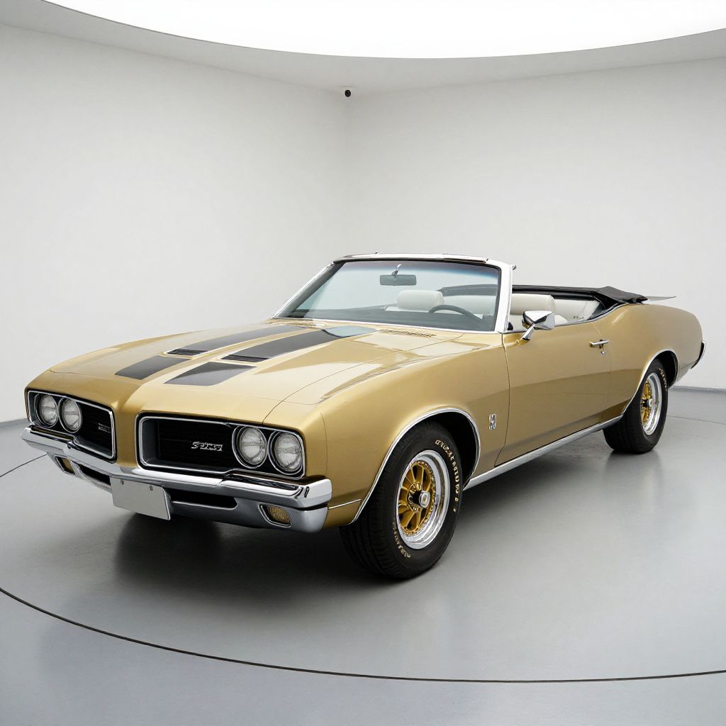 Shiny gold 1970 Oldsmobile Cutlass convertible showcased in a pristine indoor setting, featuring a black hood stripe, chrome accents, and gold-rimmed wheels, exuding classic muscle car elegance.