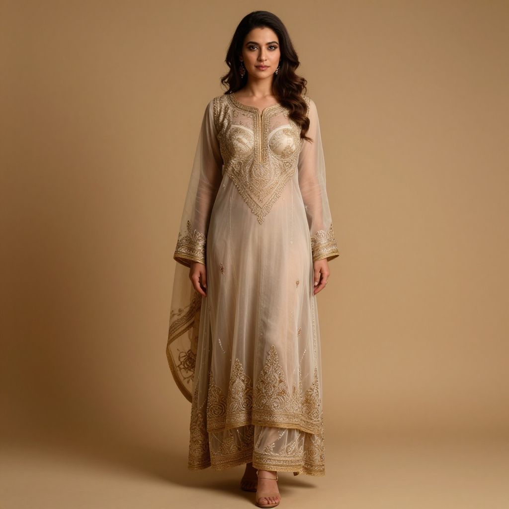 Photograph of a South Asian woman with long, wavy dark hair and medium skin tone, standing against a plain beige background. She wears a cream-colored, long-sleeved, embroidered kurta with intricate gold patterns on the chest, sleeves, and hem, and a matching dupatta draped over her right shoulder. The kurta is semi-sheer with a slight sheen. She stands confidently, looking at the camera with a subtle smile. Her feet are adorned with simple, flat, beige sandals. The lighting is soft, highlighting the elegance of the outfit and her natural beauty.
