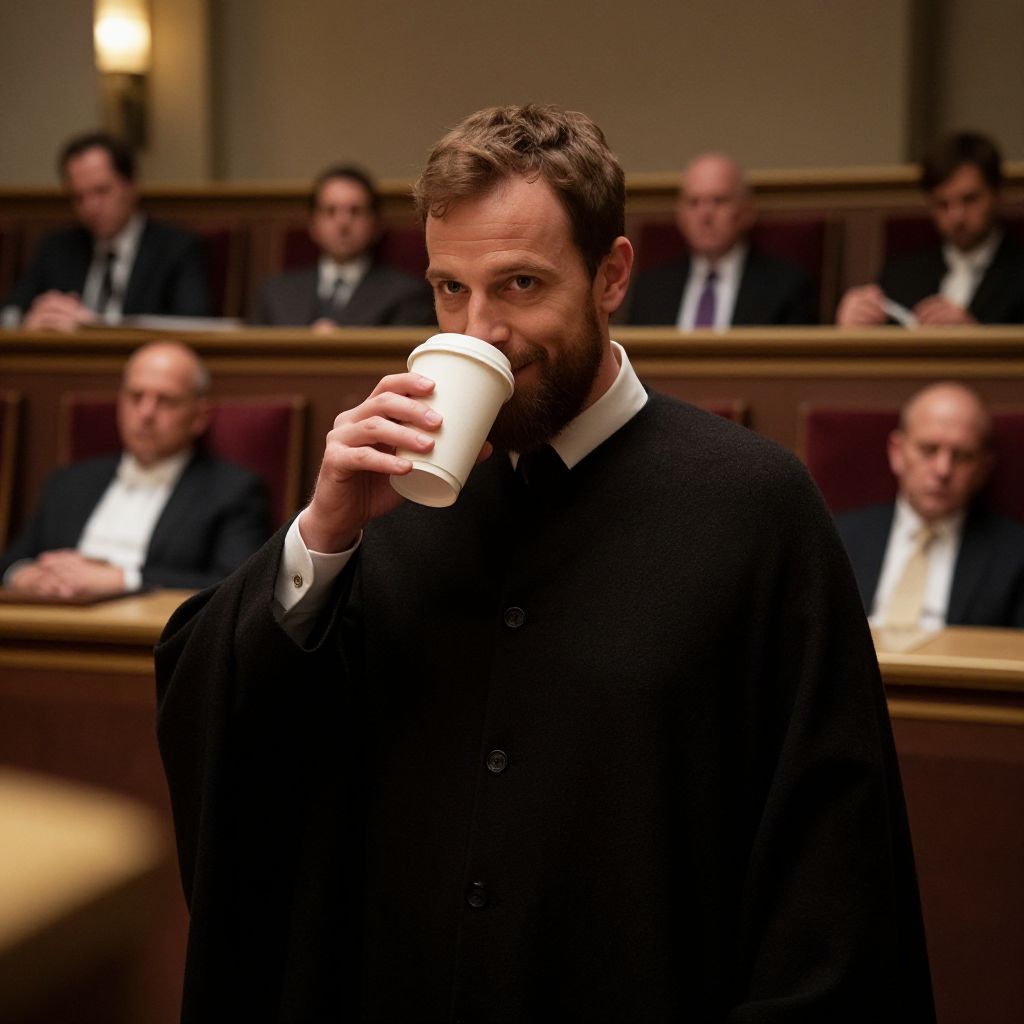 Genre roman emperor drinking coffee from a paper cup in the senate, confident smile on his face, senators sitting tired on the background, epic scene, cinematic lighting,