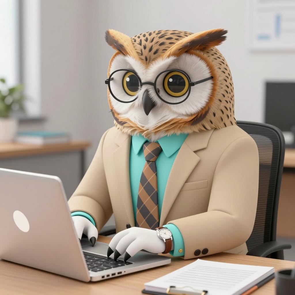 Illustration of an anthropomorphic owl dressed in a beige suit, turquoise shirt, and patterned tie, sitting at a desk working on a laptop. The owl wears round glasses and a watch, with business documents and notebooks on the desk. The scene represents intelligence and professionalism in a modern office setting.