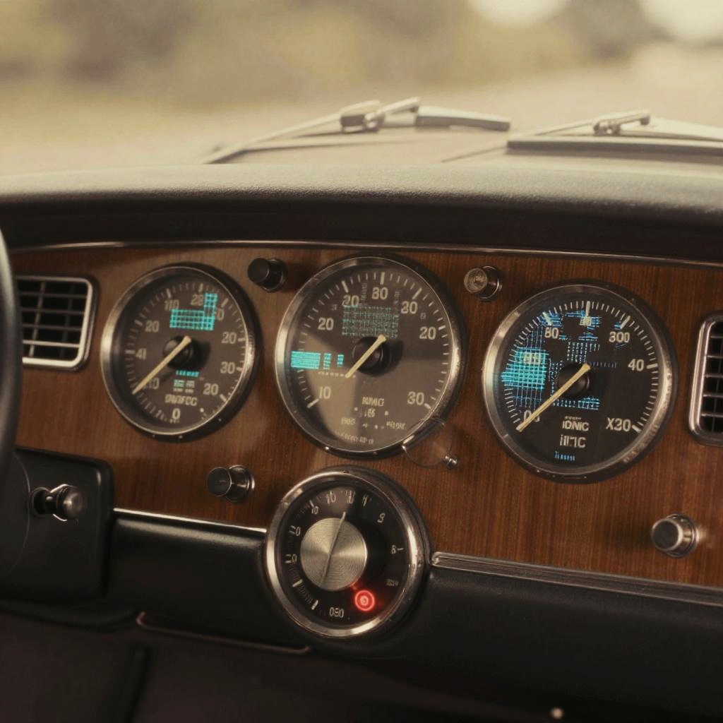 A 70s AI filter transforming a classic car interior, warm sepia tones, subtle pixel noise, animated digital grids superimposed on analog dials and wood paneling, with a slight VHS static effect, producing a nostalgic yet high-tech retro look.