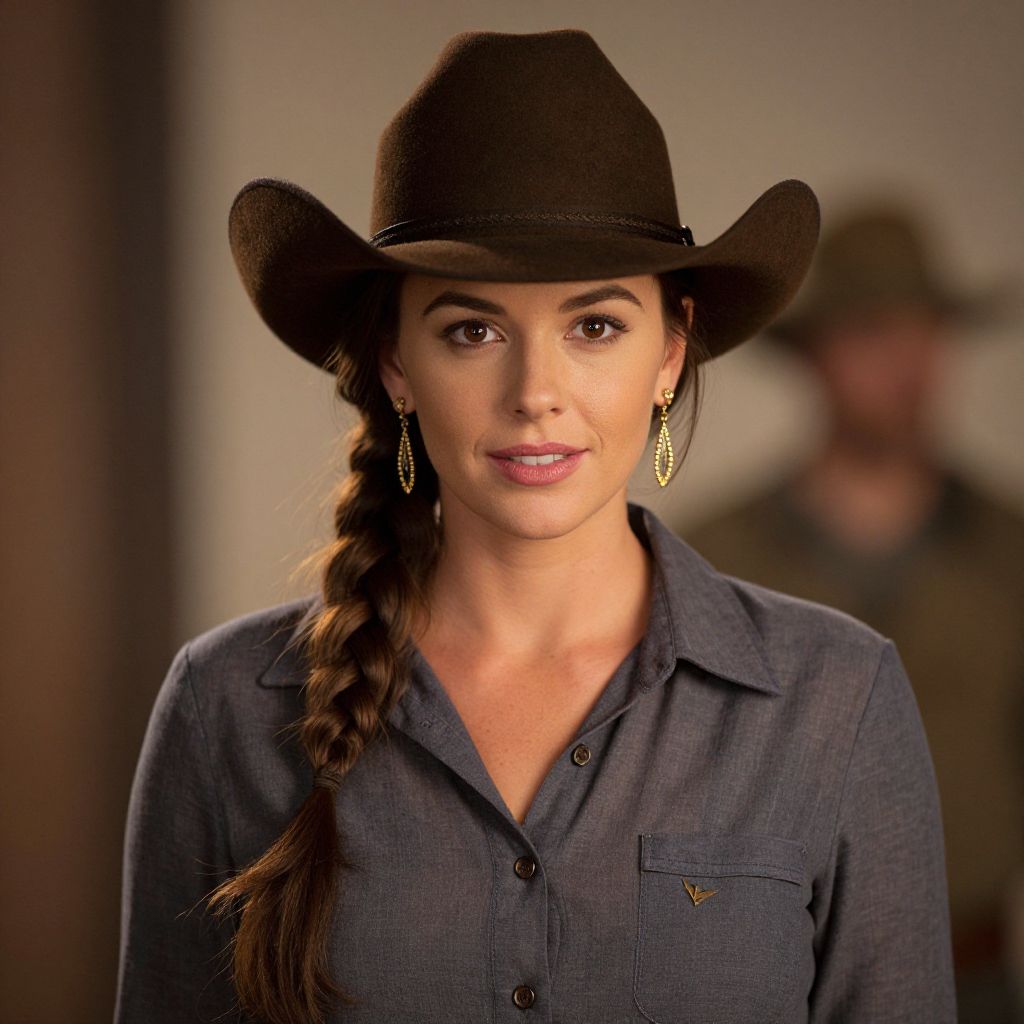 Portrait of a young woman with long brown braided hair wearing a brown cowboy hat, gold earrings, and a grey collared shirt with a breast pocket. She has a subtle smile and is looking directly at the camera against a softly blurred background with another person in similar attire.