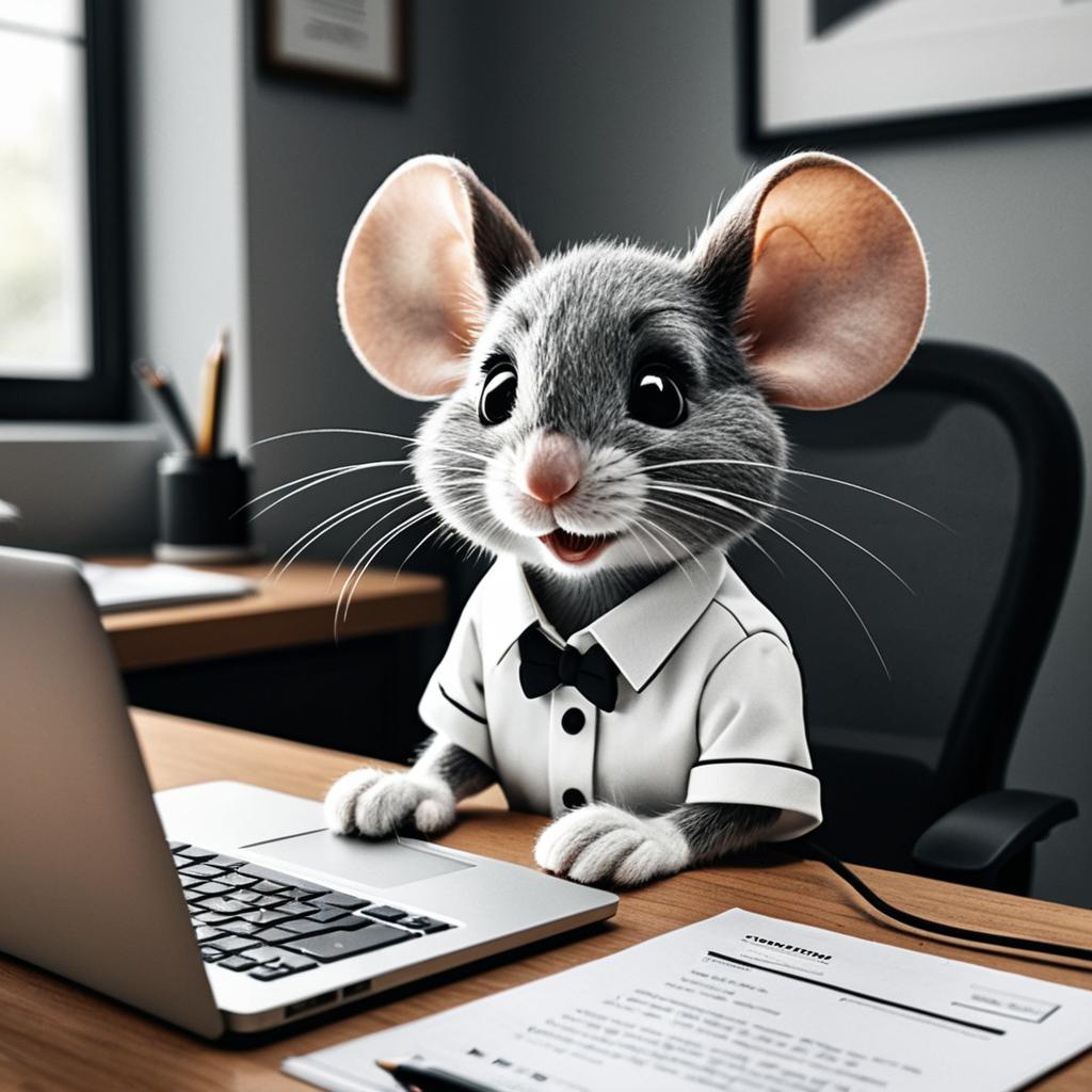 Create a cute and clever cartoon badger portrait, sitting at a desk with a laptop and resume. The badger should exude confidence and intelligence while maintaining a playful look in a lighthearted atmosphere.