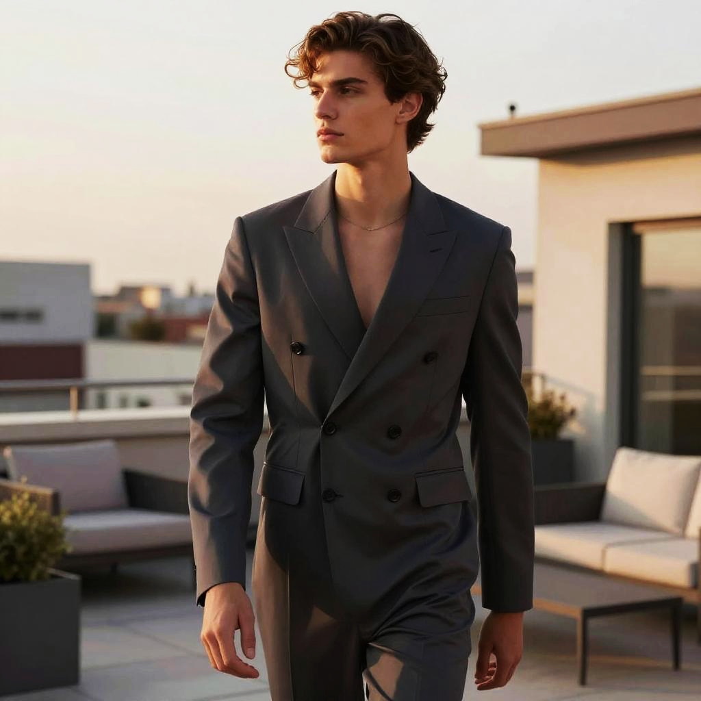 A confident young man with spiked hair dressed in a sharp double-breasted navy suit stands on a rooftop terrace overlooking a city skyline at sunset. The warm golden light highlights his formal attire and serious expression, creating a stylish and modern urban portrait.