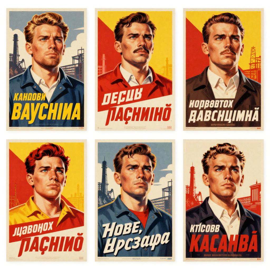 Propaganda poster generator tool showcasing a variety of retro socialist realism style templates, dramatic facial expressions, heroic workers, industrial backgrounds, striking use of red and yellow hues, bold Cyrillic fonts, evokes revolutionary fervor and unity