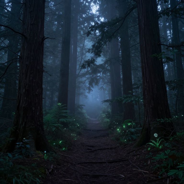 Photograph of a dense, misty forest at night. Tall, dark, towering redwood trees dominate the scene, creating a vertical composition. A narrow, dirt path stretches into the foggy distance, illuminated by soft, ethereal blue and white light from above. Green ferns and small plants with glowing, bioluminescent lights line the path on both sides. The trees' rough, textured bark contrasts with the smooth, misty atmosphere. The overall mood is mystical and tranquil, with a cool, blue color palette and a sense of depth and mystery.