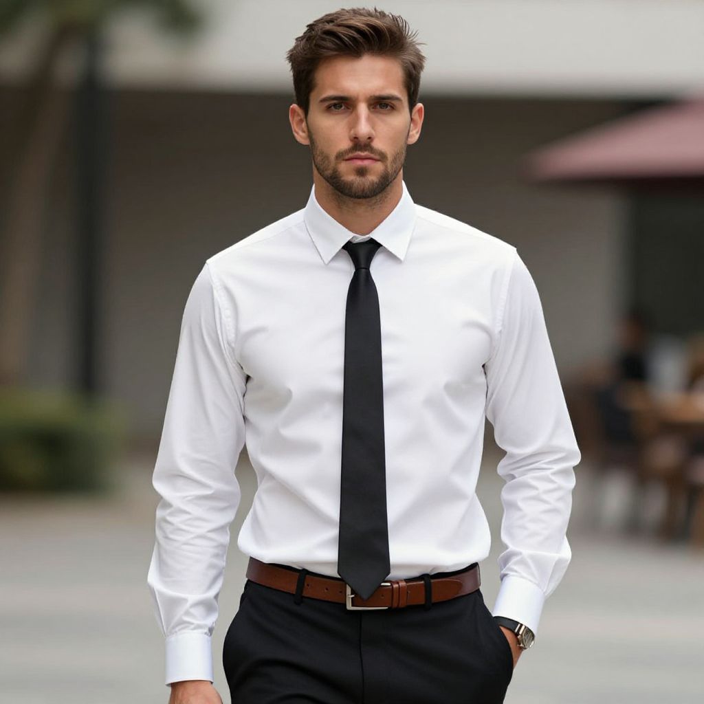 Photograph of a handsome, bearded man with dark hair, wearing a white dress shirt, black tie, and dark pants, walking confidently outdoors.