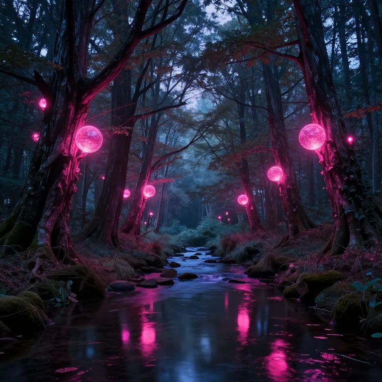 In a mystical forest bathed in ethereal twilight, ancient trees adorned with glowing orbs of neon pink light cast magical reflections upon a tranquil stream, creating a surreal symphony of luminescence and wonder.