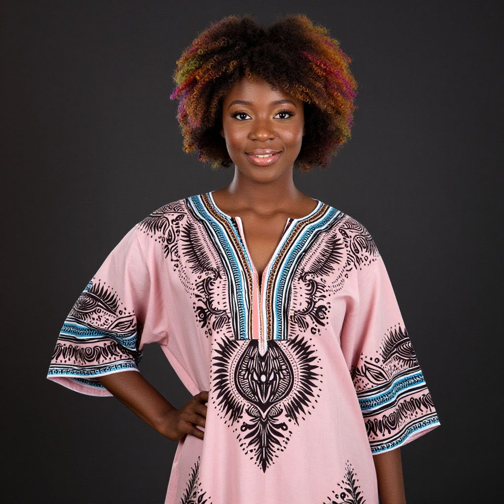 A beautiful black woman with a vibrant, colorful afro stands proudly, wearing a light pink caftan with intricate patterns, against a dark background.